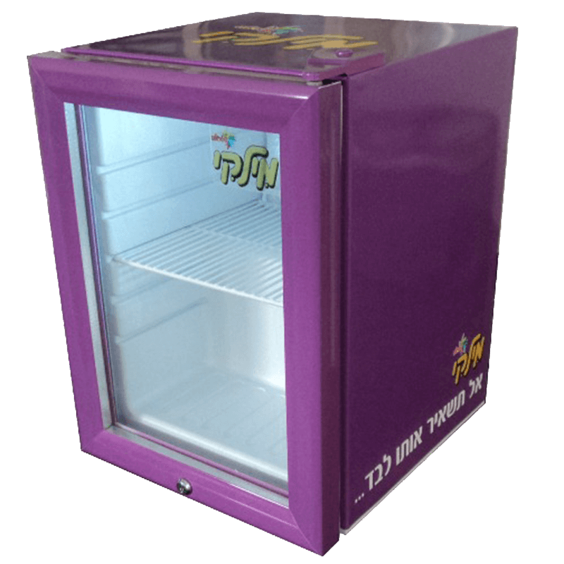 מקרר תצוגה הפועל באמצעות מדחס עם דלת זכוכית המיועד לאחסון משקאות או כל מוצר אחר. יכול גם להתאים כמקרר למשרד.